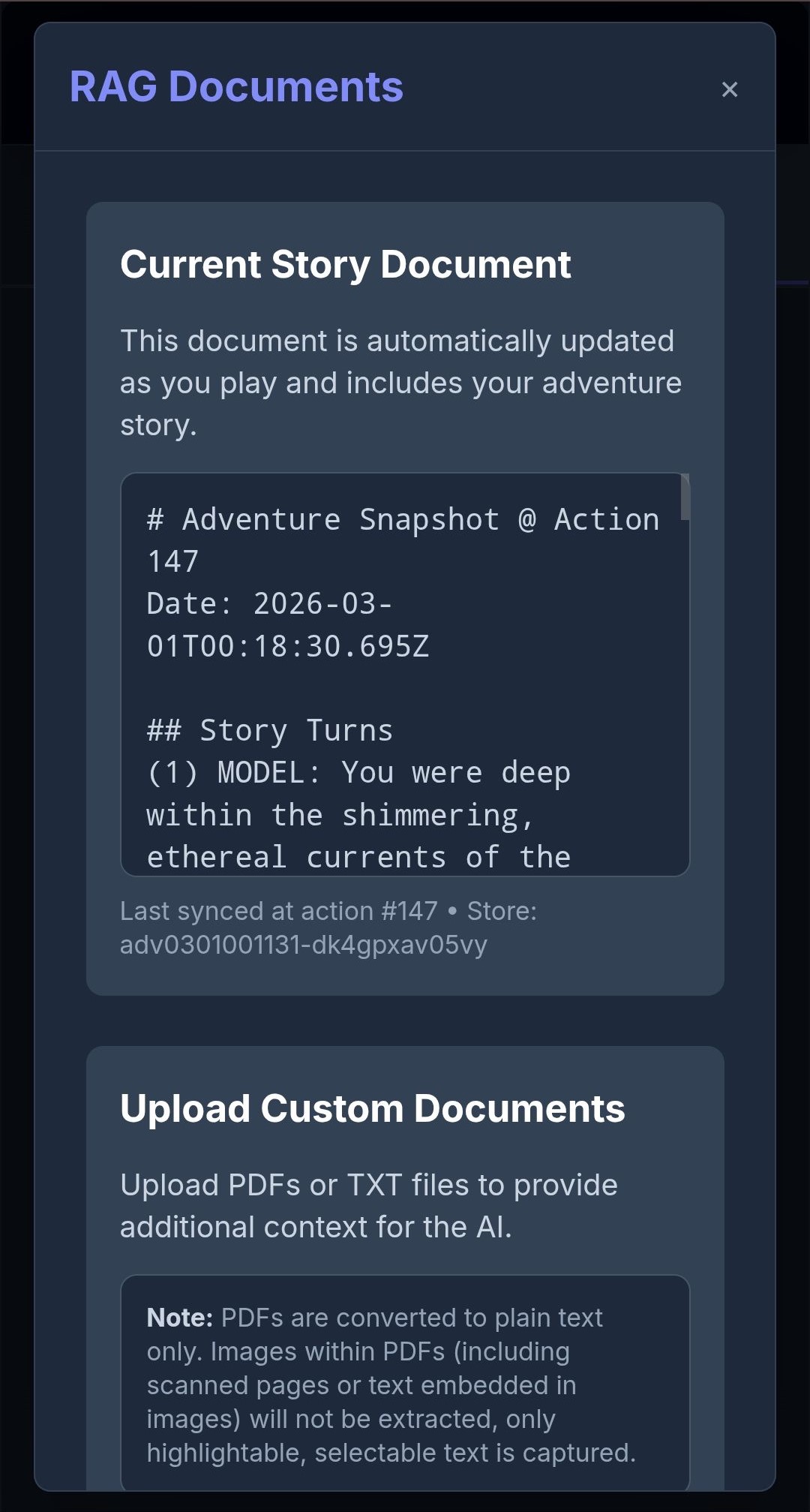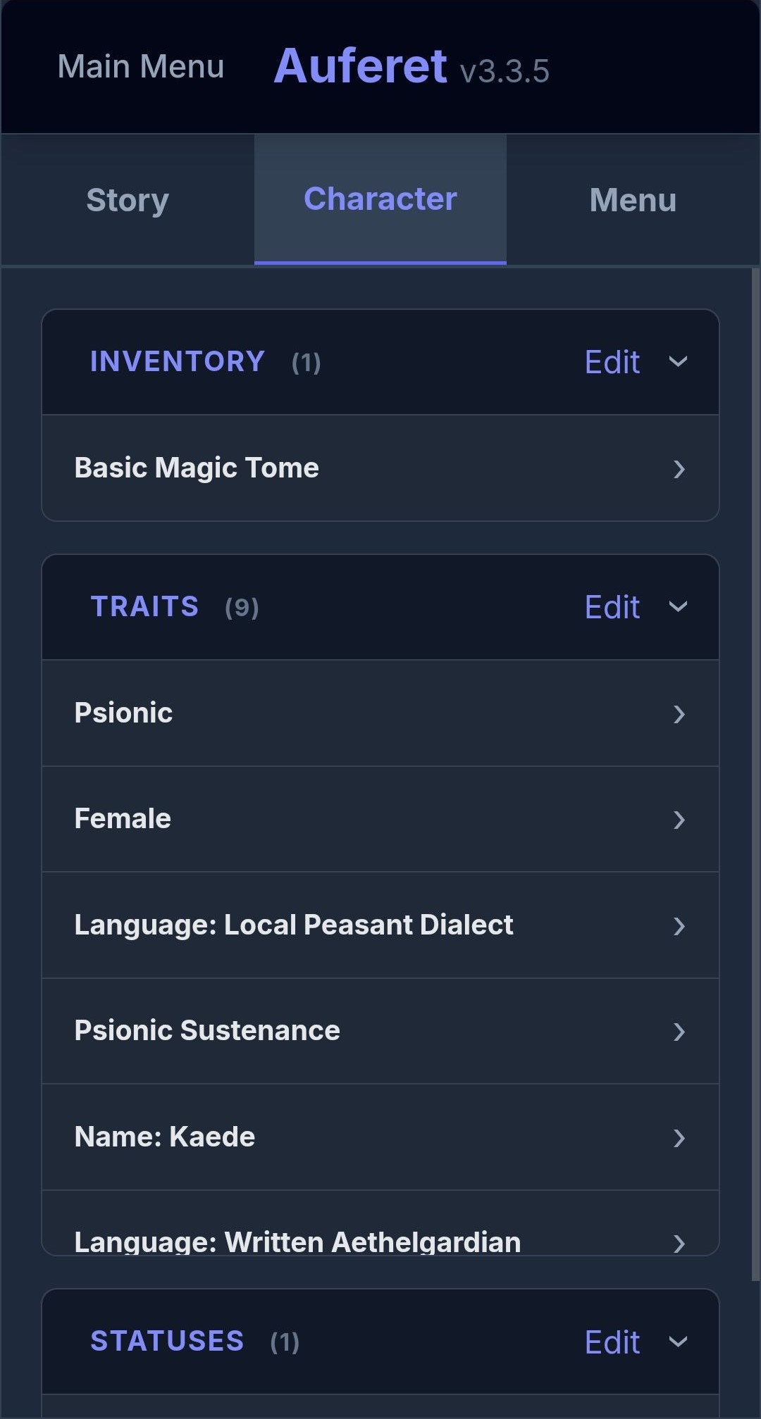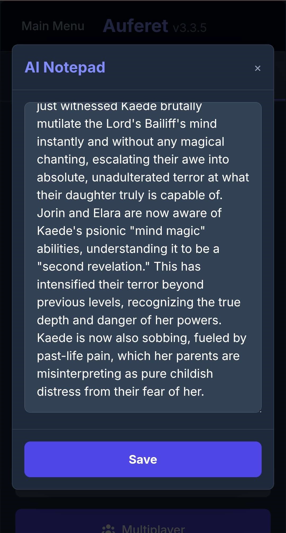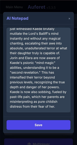 Auferet has an AI game master powered by Google Gemini that actually runs your game. It tracks your character stats, manages world lore through world cards, logs your NPC relationships, keeps a session notepad, and rolls dice to keep outcomes genuinely unpredictable. It plays like a RPG, not a conversation.